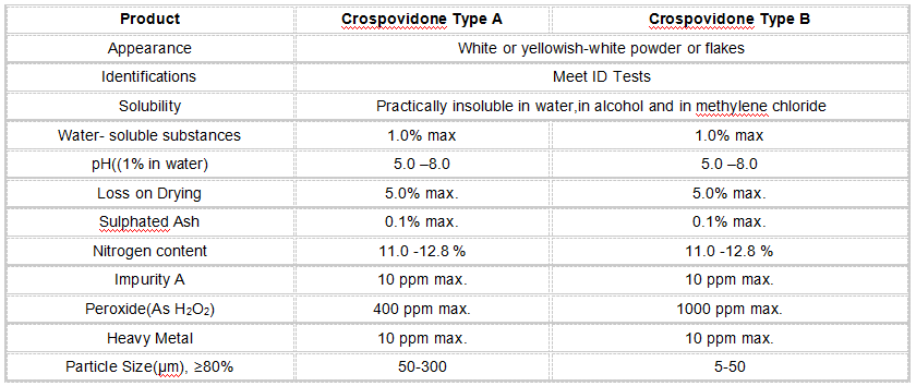Product Properties: Crospovidone is hygroscopic,insoluble in water and all other common solvents,but it swells rapidly in aqueous solutbition without any gel froms.Its; classified as Crospovidone Type A and Type B according to the different particle size.